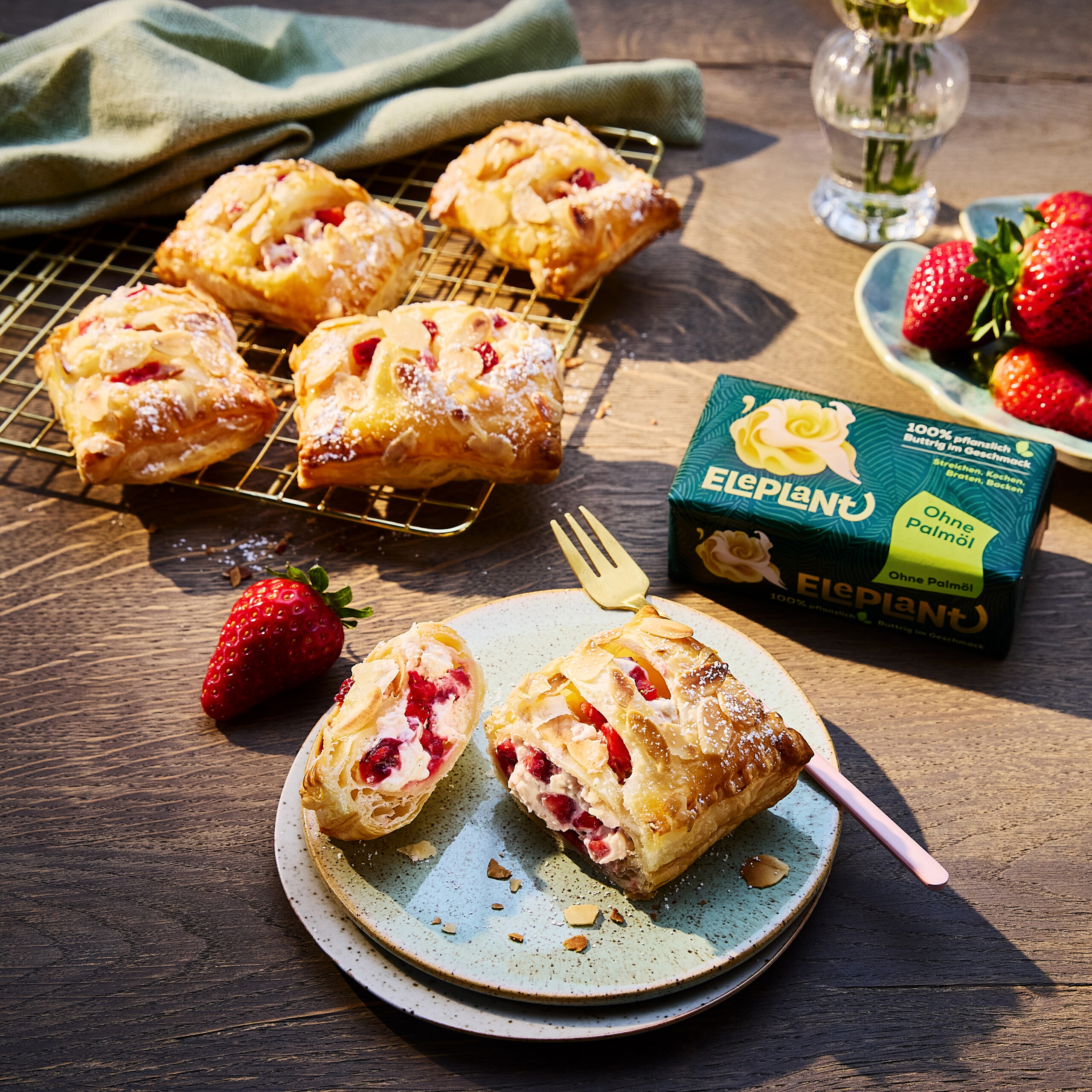 Hilter, 16. April 2025. Die Erdbeersaison ist da – und mit ihr der Geschmack des Sommers. Ob pur, im Dessert oder in herzhaften Kombinationen: Erdbeeren sind vielseitig, beliebt – und einfach köstlich. In Kombination mit der pflanzlichen Butteralternative Eleplant entsteht ein unkomplizierter Snack mit Wow-Effekt: Erdbeertaschen mit cremigem Quark und knusprigem Blätterteig. Dieses Rezept vereint die Süße der Beeren mit der Cremigkeit des Quarks und der feinen Buttrigkeit von Eleplant – für alle, die gerne backen, Snacks lieben und den Geschmack von Butter schätzen.