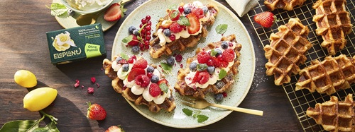 3. Für die Croffles die aufgetauten Croissants mit der geschmolzenen Eleplant bestreichen und rundherum in Zucker wälzen, sodass sie gleichmäßig bedeckt sind. Bei mittlerer Temperatur im Waffeleisen für Brüssler Waffeln etwa 3–5 Minuten goldgelb und knusprig backen und anschließend leicht abkühlen lassen.