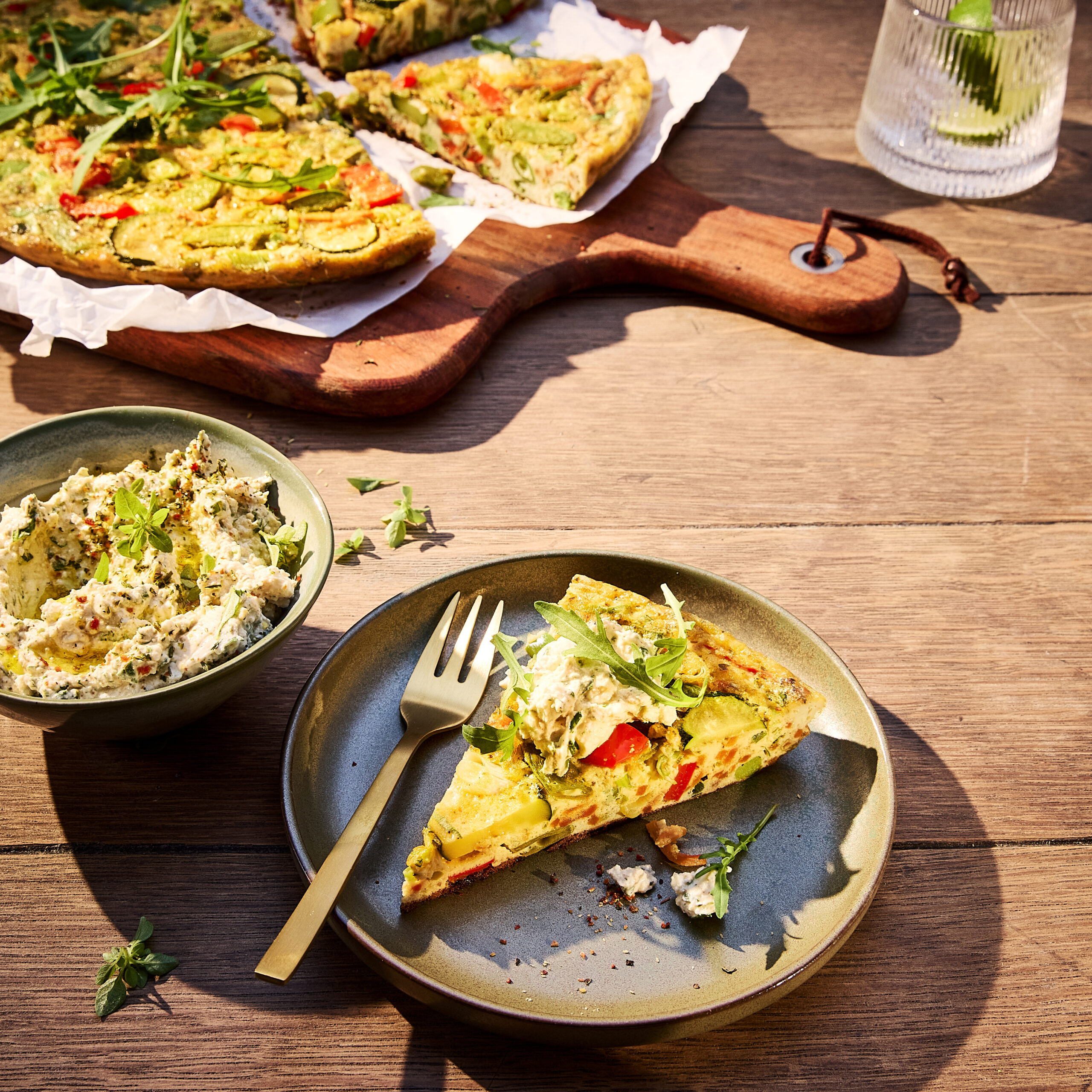 Das Frühlings-Omelett bietet eine leckere Kombination aus fluffigem Ei, knackigem Gemüse und pikantem Feta-Dip – ideal für eine leichte Mahlzeit.