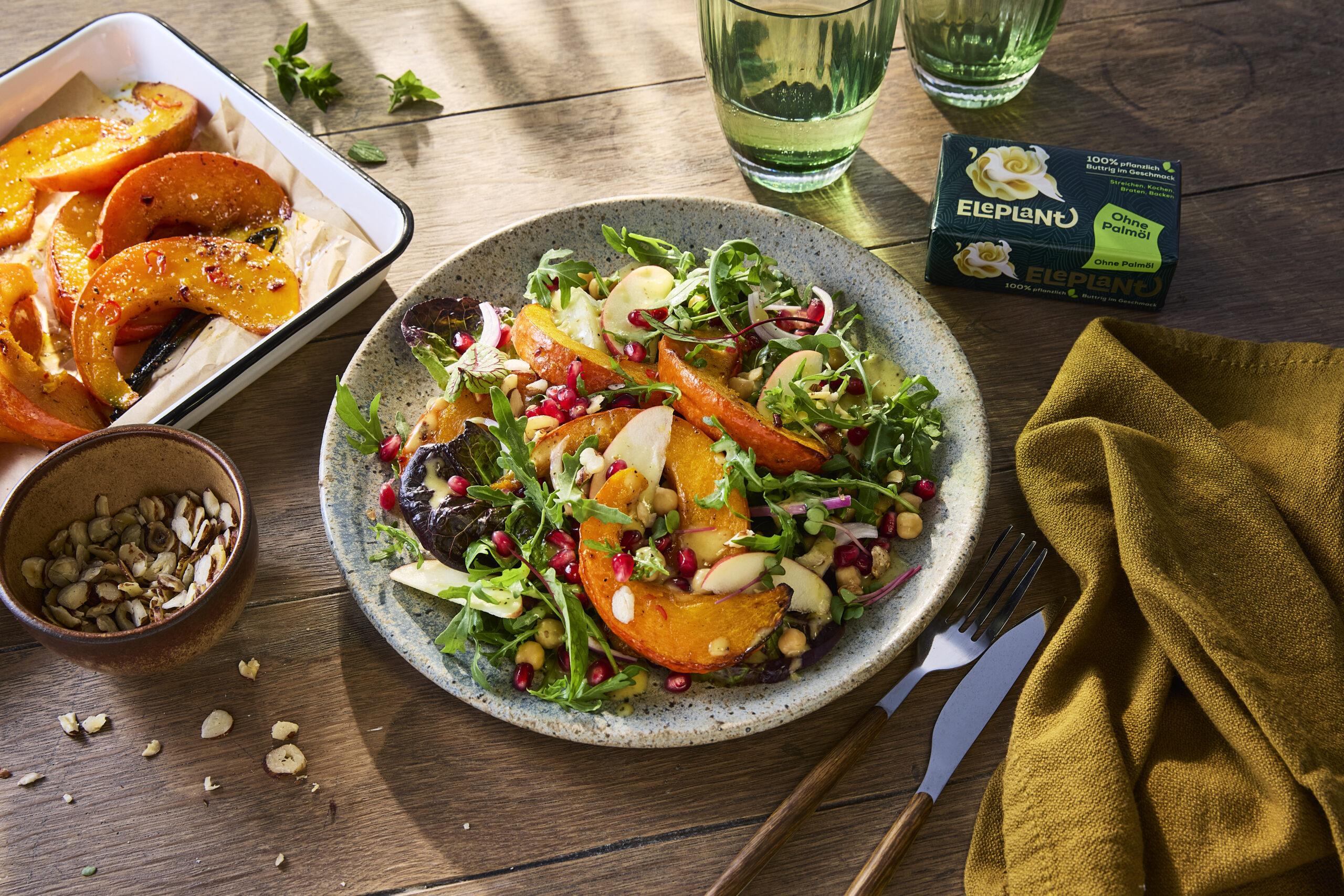 knackig bleiben. Die auf dem Backblech zurückgebliebene vegane Vanille Butter über den fertigen Salat träufeln –