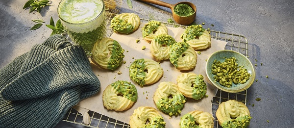Dieses leckere Spritzgebäck ist kein normales Spritzgebäck! Die Plätzchen sind mit Pistazien und Matcha verfeinert und sehen dazu noch besonders aus.