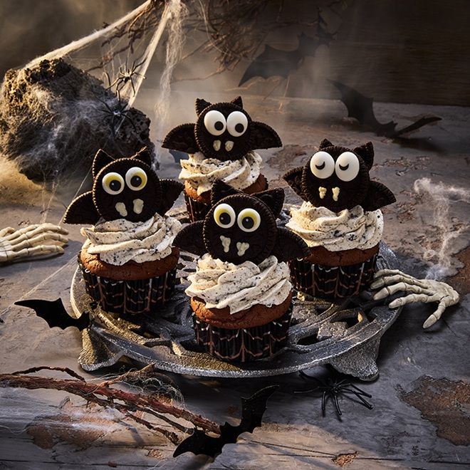 6. Die abgekühlten Muffins mit dem Frosting aufspritzen und mit den Fledermäusen garnieren.