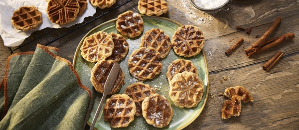 1. Für die Waffelplätzchen das Weizenmehl mit dem Rohzucker, dem Zimt, Backpulver und einer Prise Salz vermengen. Die zimmerwarme Eleplant sowie das Ei zugeben und alles zu einem weichen, glatten Teig verkneten. Den Teig etwa 10 Minuten kaltstellen und anschließend zu kleinen Kugeln (à ca. 15 g) formen.