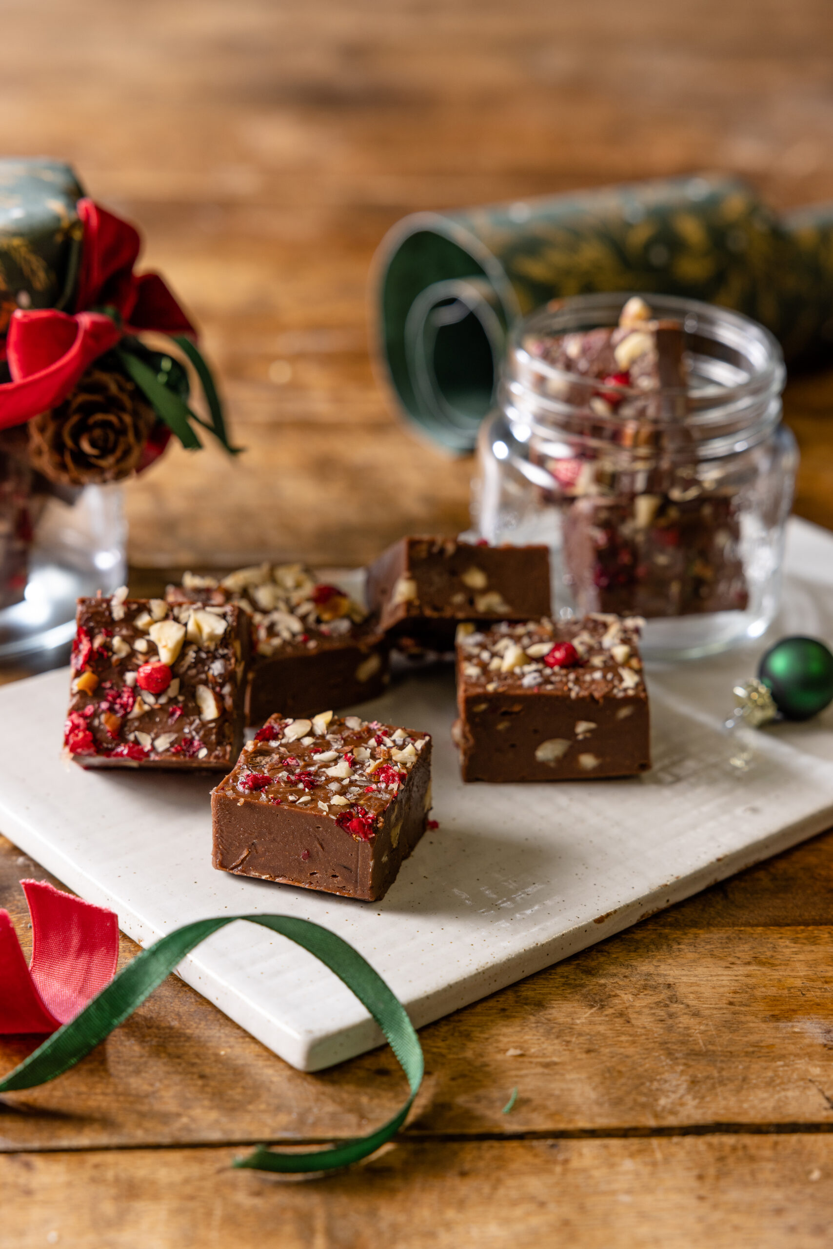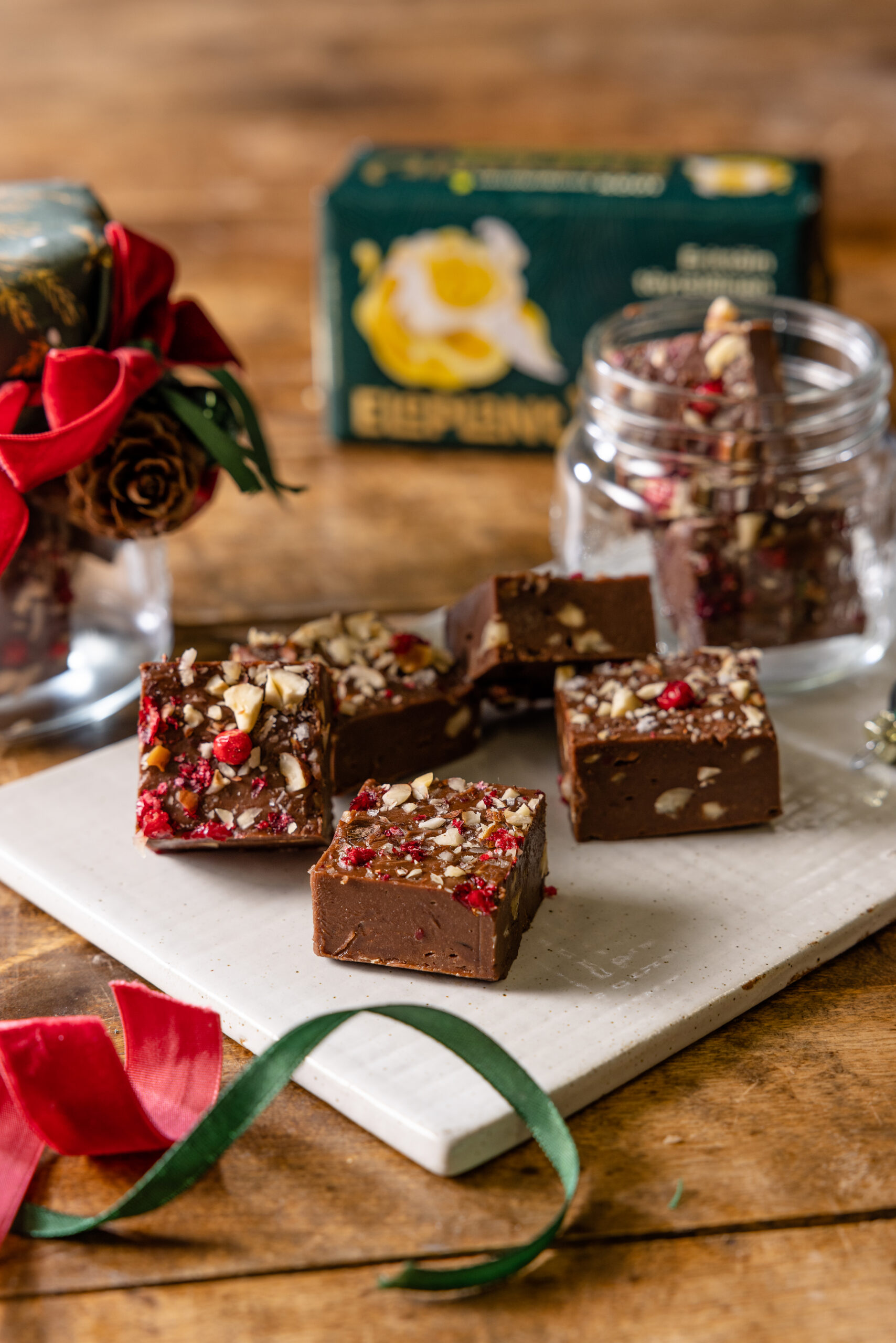 In einem Topf die Sahne, den Zucker und den Glukosesirup auf 116 Grad erhitzen und ca. 5 Minuten abkühlen lassen. Eleplant, Zimt, Schokolade und zerkleinerte Nüsse hinzufügen. In einer Küchenmaschine oder einem elektrischen Mixer ca. 2-3 Minuten schlagen. Die Masse in eine mit Backpapier ausgelegte Pfanne (ca. 20 x 20 cm) geben und mit einer Prise Salz und getrockneten Preiselbeeren bestreuen. Ca. 1 Stunde kühl stellen. Wenn die Masse abgekühlt ist, den Fudge in Stücke schneiden. Den Chocolate Fudge im Kühlschrank aufbewahren und ca. 30 Minuten vor dem Servieren auf Zimmertemperatur bringen.